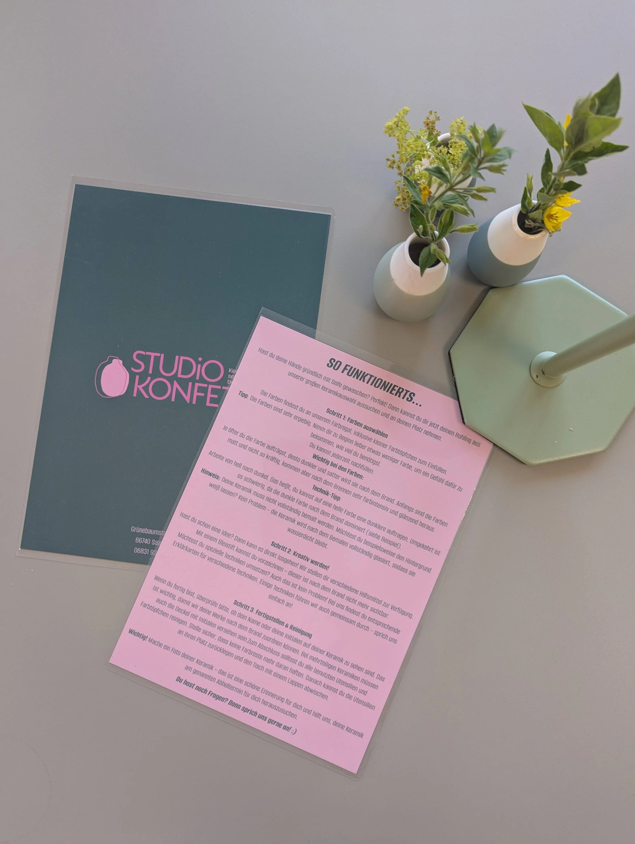 Buche ganz bequem einen Termin über unsere Website und wähle dabei deine gewünschte Kategorie aus – zum Beispiel „Keramik selbst bemalen“ oder vielleicht doch ein „Geburtstags-Event“. Am Tag deines Termins erscheinst du pünktlich bei uns. Vor Ort erhältst du eine kurze Einführung in das Bemalen von Keramik, damit du bestens vorbereitet bist.